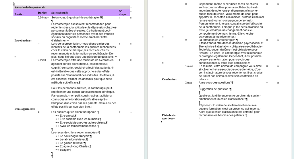 Voici un plan que j’ai préparé pour un exposé sur la zoothérapie en cours de communication orale d’affaires: