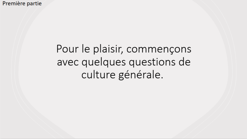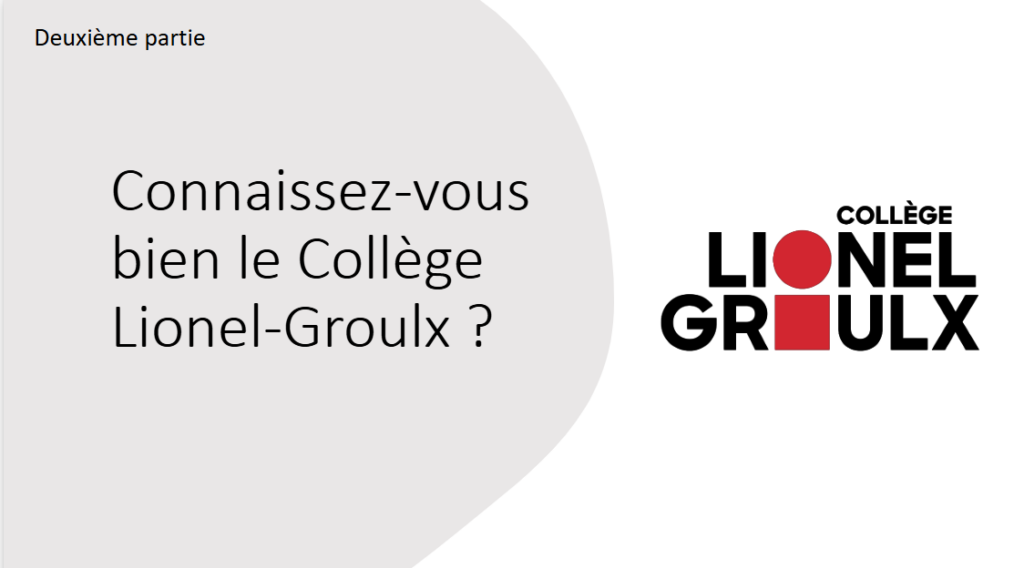 À l’aide de PowerPoint, j’ai réalisé un jeu-questionnaire en deux parties : la première partie contenait des questions générales et la deuxième partie portait sur des connaissances sur le collège Lionel-Groulx.